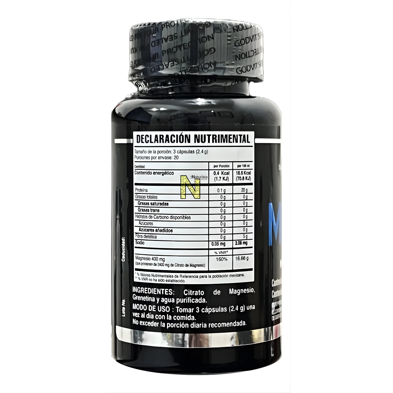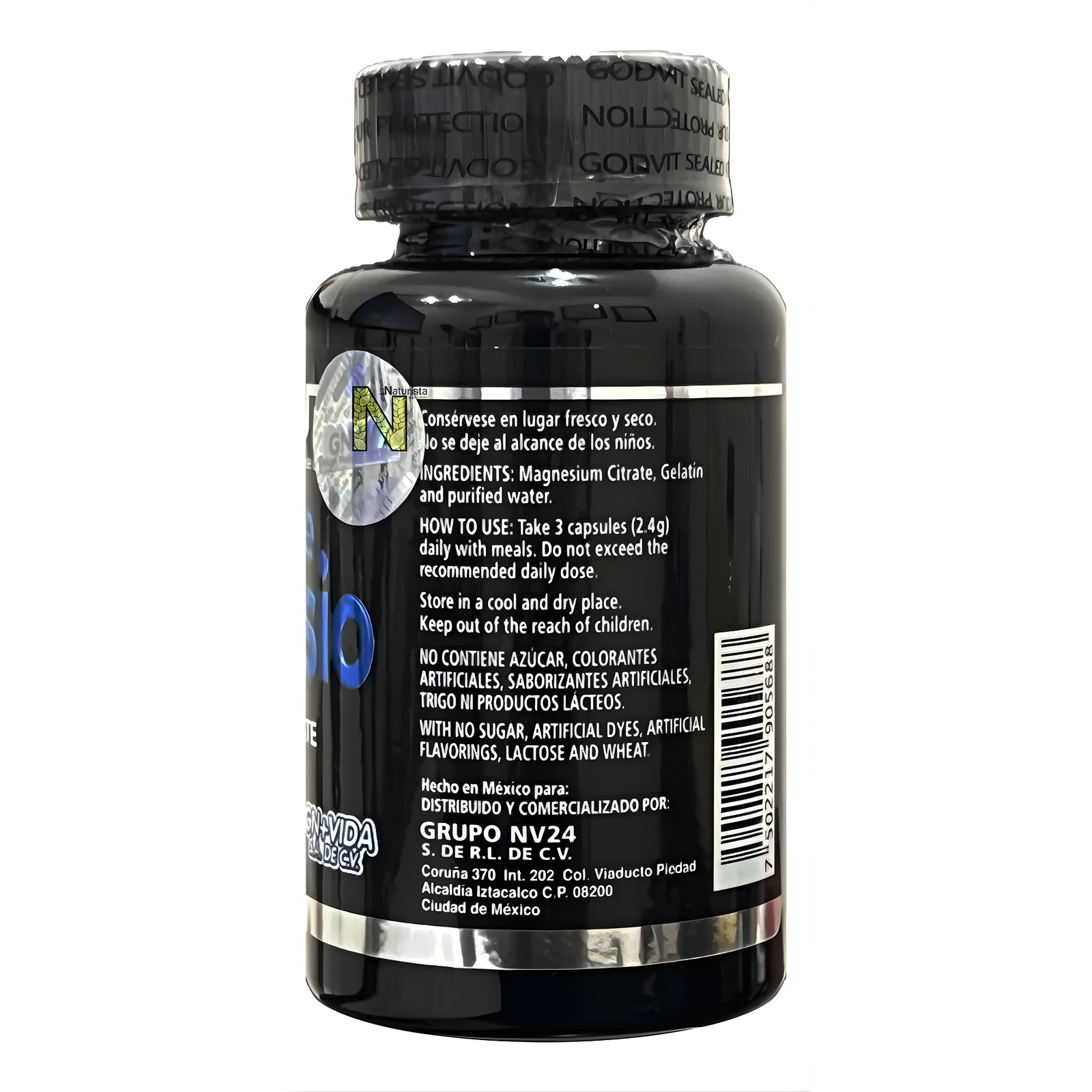 Cada cápsula contiene citrato de magnesio de alta pureza, un mineral esencial que contribuye al funcionamiento normal del sistema muscular, nervioso y digestivo.